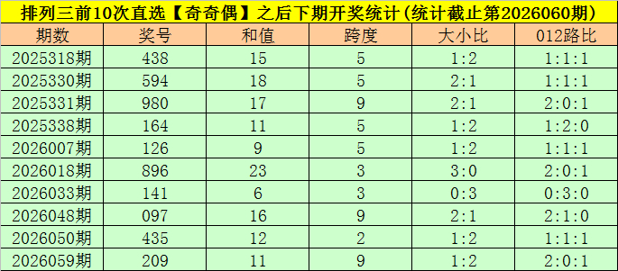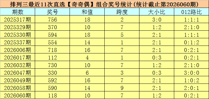 开奖回顾:排列三第2026060期开出奖号:118,类型为组三,和值为10,奇偶比为2:1,大小比为1:2,跨度为7。